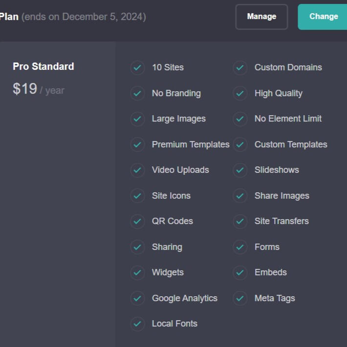 Mul on ostetud $19 aastas plaan, nii et saan 10 sellist lehte luua erinevateks tarbeteks ja kõiki neid eeliseid, mida pildilt näed